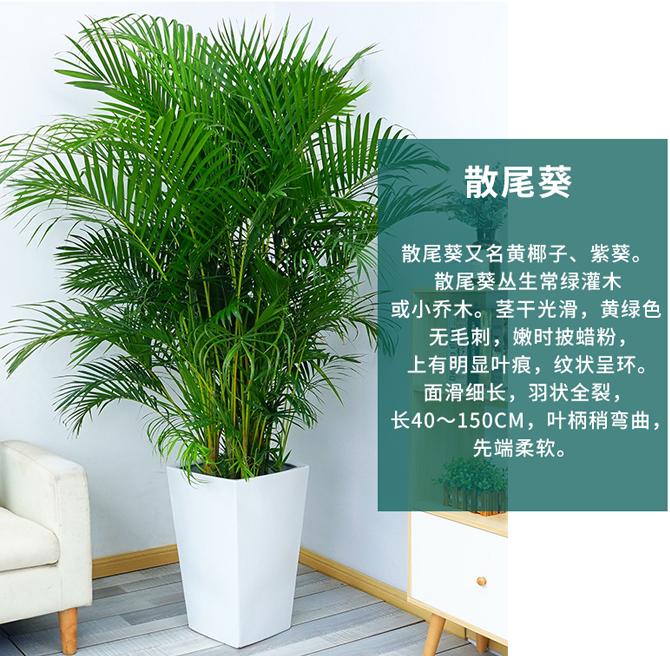产品简介:散尾葵能够有效去除空气中的苯、三氯乙烯、甲醛等有挥发性的有害物质。散尾葵与滴水观音一样,具有蒸发水气的功能,如果在家居种植一棵散尾葵,能够将室内的湿度保持在40%~60%,特别是冬季,室内湿度较低时,能有效提高室内湿度。